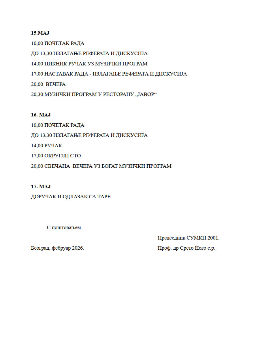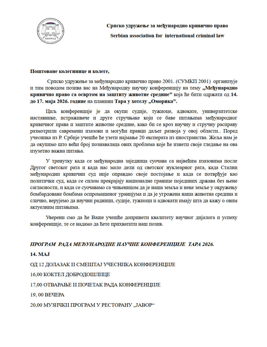 Српско удружење за међународно кривично право 2001. (СУМКП 2001) организује и тим поводом позива вас на Међународну научну конференцију на тему "МЕЂУНАРОДНО КРИВИЧНО ПРАВО СА ОСВРТОМ НА ЗАШТИТУ ЖИВОТНЕ СРЕДИНЕ" која ће бити одржати од 14. до 17. маја 2026. године на планини Тара у хотелу „Оморика”.